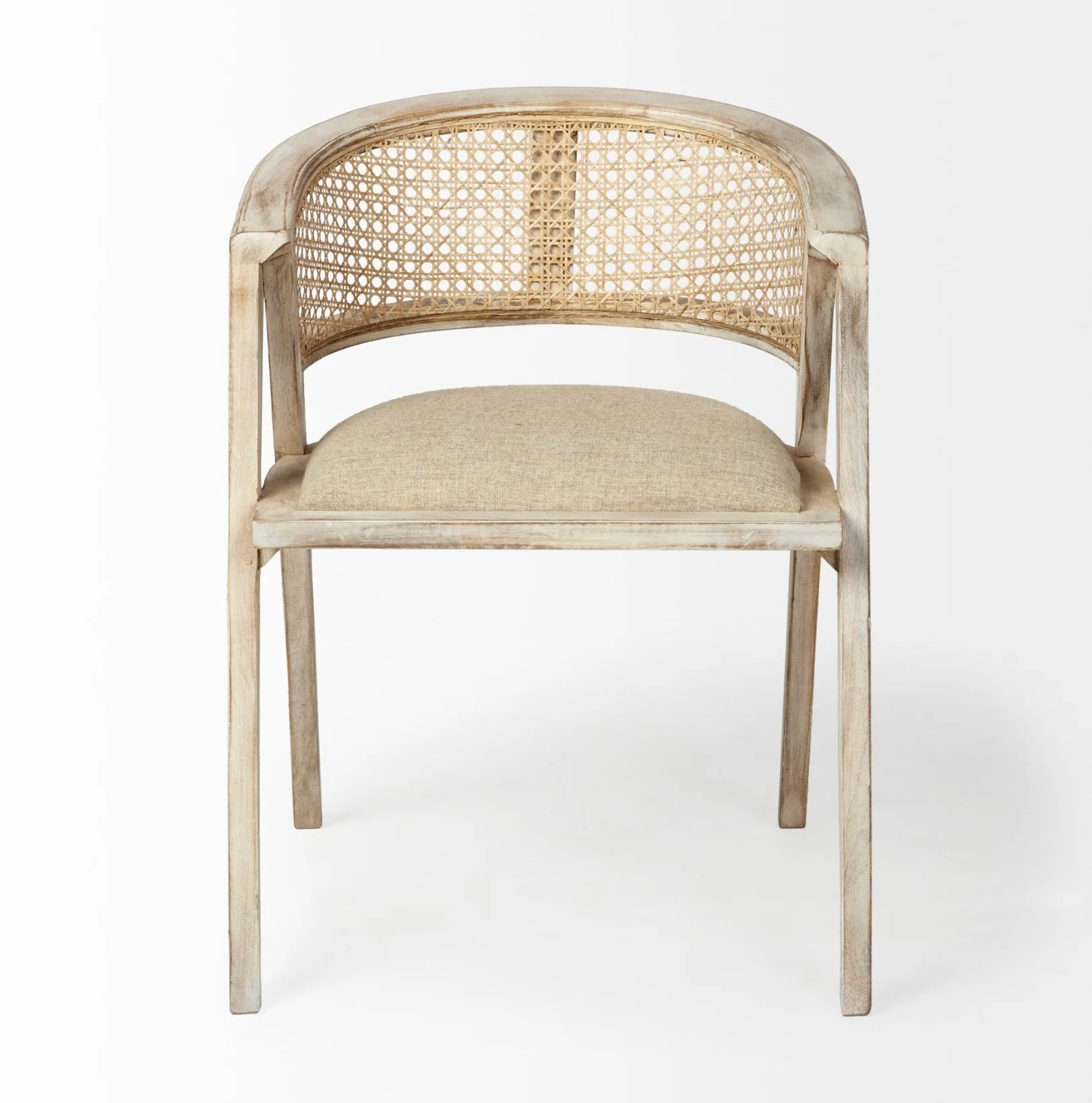 The Frankie Dining chair is a simple yet elegant wooden dining chair featuring a curved cane back and a comfortable fabric seat.