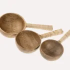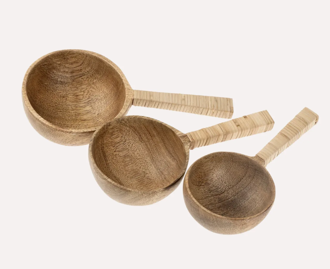 These beautiful little scoops are handcrafted in India from sustainable mango wood and feature wrapped bamboo around their handles. Use them to scoop loose leaf tea or coffee grounds, flour and baking supplies, or in the bathroom for bath salts. Hand wash with mild soap and water.