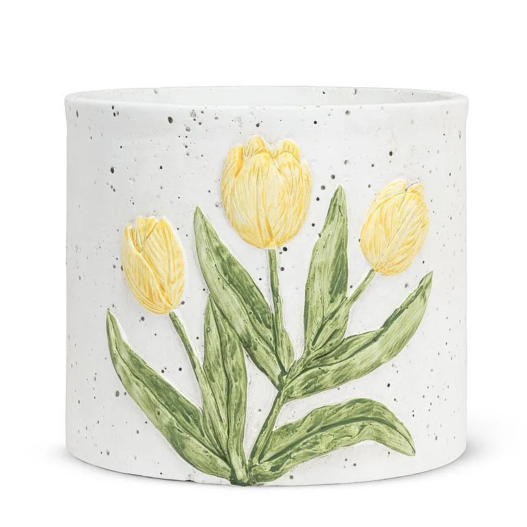 This white cement planter blooms with sculptural detail, featuring a bold yellow tulip at its front. Sized to hold statement greenery, it brings floral inspiration with a grounded, modern feel. 6.5 inches tall